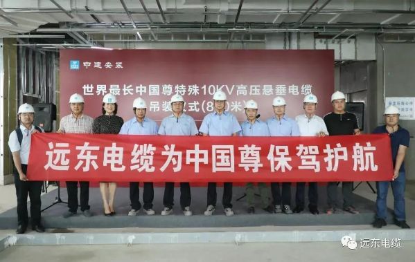 從2018年3月首批產品敷設,到8月份長達820米的世界最長特殊10KV高壓垂懸電纜成功敷設,歷經6個月的吊裝作業,遠東電纜一共為中國尊項目敷設了24根懸垂電纜,總長達15132米,總重達136.38噸,創造了多個世界首次、世界之最。這一成績的取得離不開遠東團隊的努力和付出,從電纜進場開始就進行全程跟蹤,以創新技術破解了超高層供電系統技術難題,保障了吊裝電纜敷設工作安全、有序進行,實現了超高層垂直高壓電纜敷設技術的新突破。